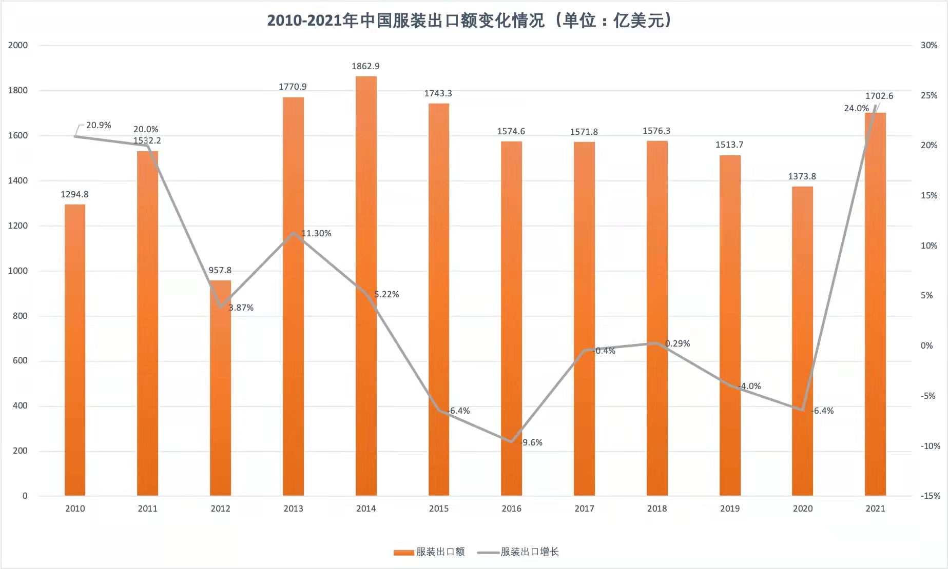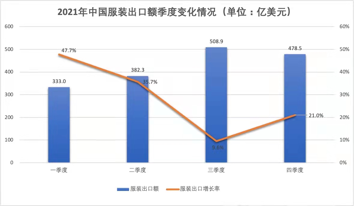 外需大量增加、服装订单回流,让中国服装出口再创高峰。据海关总署数据显示,2021年全国纺织品服装出口3154.7亿美元(该口径不含褥垫、睡袋及其他寝具),同比增长8.4%,创历史性新高。其中,服装全年出口1702.6亿美元,同比增长24%,是近十年以来的最大增长幅度。
